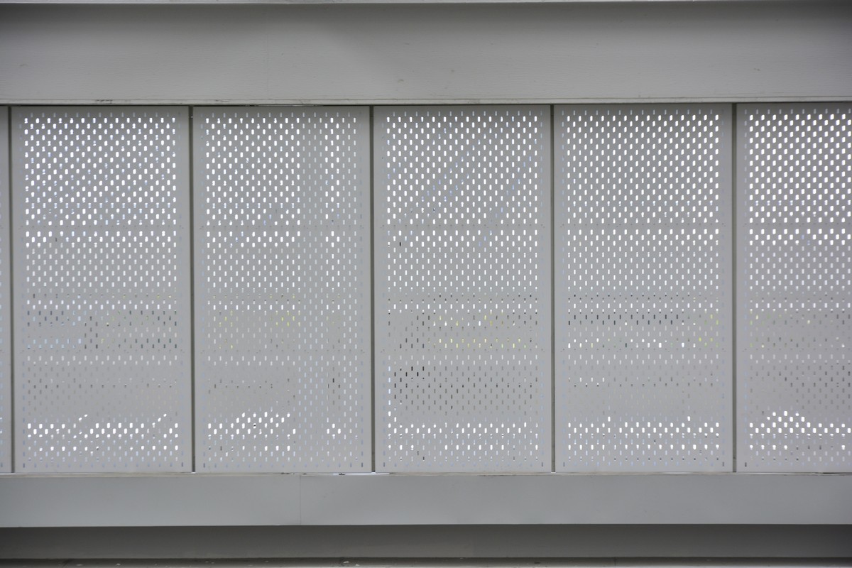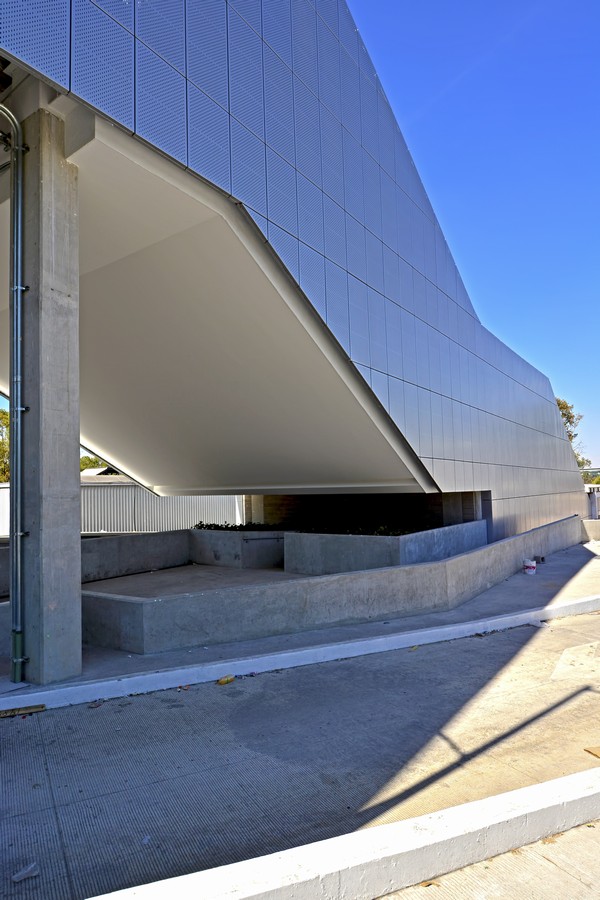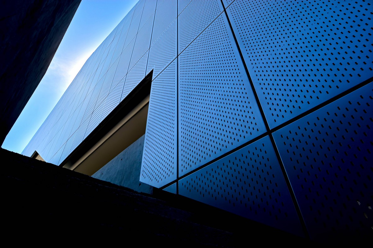It has a perforated aluminum façade system with electrostatic paint in metallic colors.